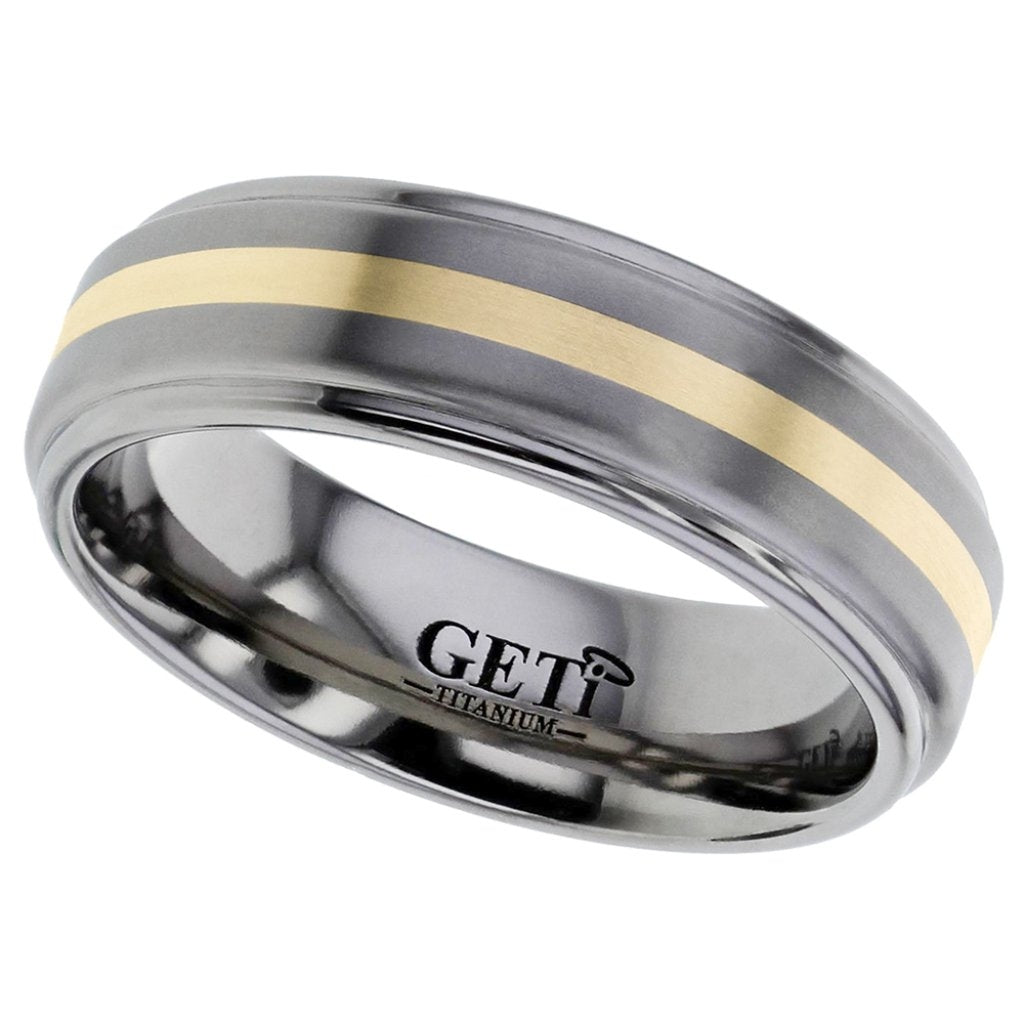 Flat, shouldercut profile Titanium ring with 1mm - 1.5mm wide precious yellow metal inlay.