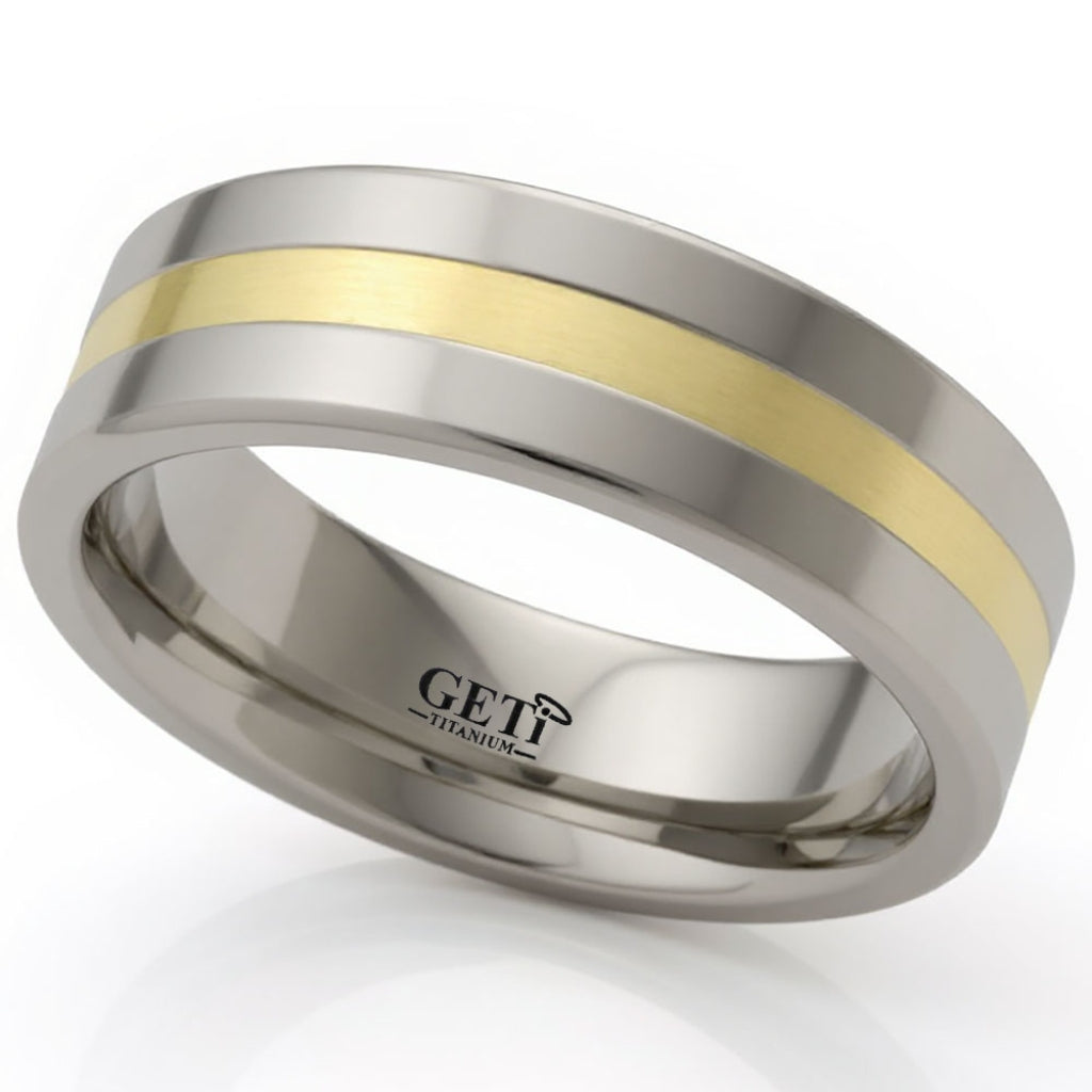 This Titanium ring has a modern flat profile and a central precious metal inlay for a sophisticated finish. The Titanium is resistant and hard-wearing, providing a secure setting for the luxurious precious metal inlay. The Titanium is available polished to a high-gloss finish or with a silky satin texture. It is an elegant yet durable piece of jewellery that can be worn for any occasion. The ring is great for everyday wear as a wedding or dress ring and is hypoallergenic, making it suitable for those with sensitive skin. It makes a special gift for someone you love and is sure to be cherished for many years to come.