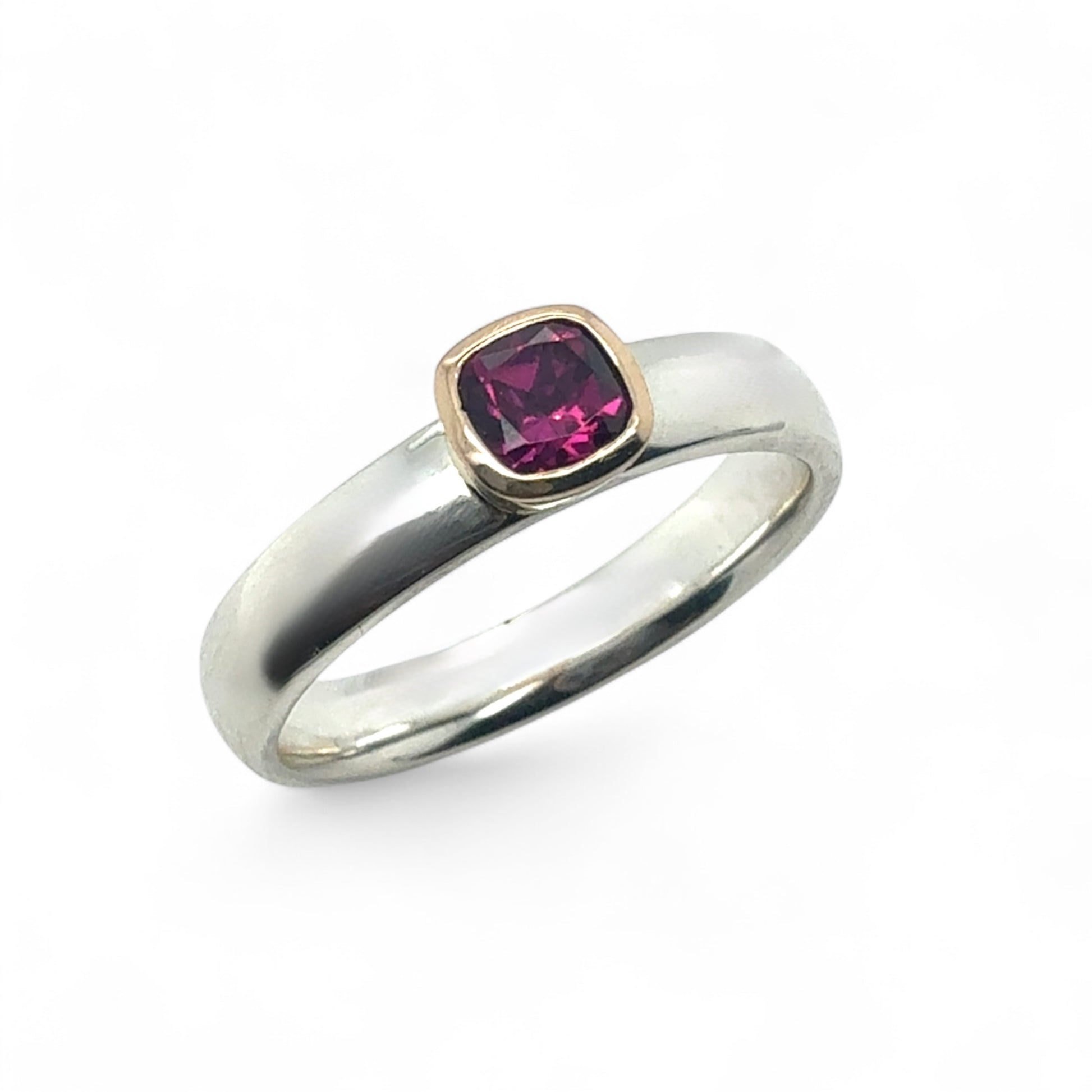 This stunning mixed metal ring features a beautiful purple pink cushion cut Rhodolite garnet, carefully set in a 14ct yellow gold protective and modern rub over setting on a sterling silver band. Finished to a high shine, it is perfect for everyday wear. Whether you're celebrating a January birthday, looking for an alternative engagement ring, or simply love the design, this ring is a great choice.