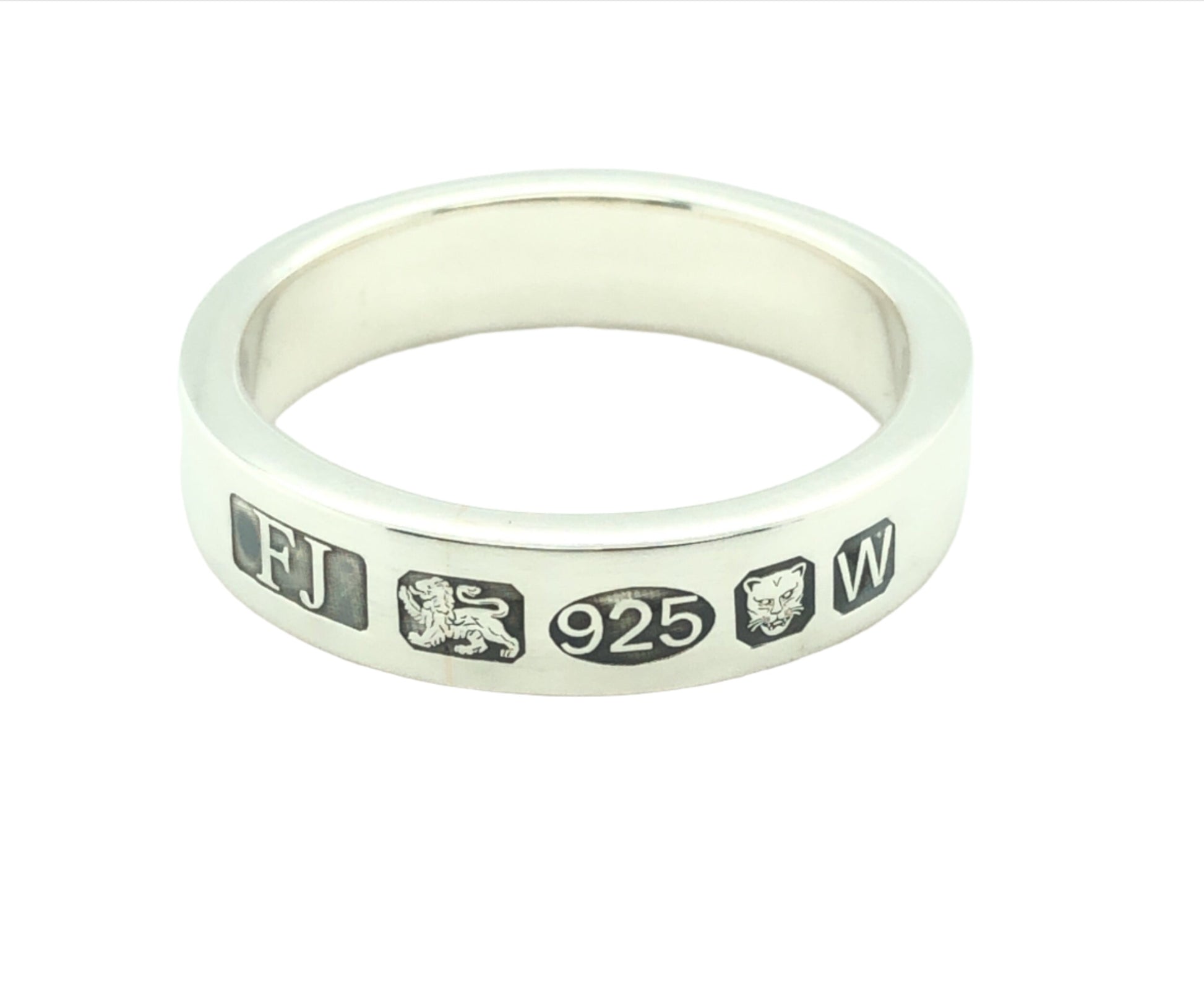 This Silver ring features a Genuine oversized FJ Jewellery Hallmark on the outside of the ring and is Blackened so that the images are visible. The mark is lasered onto the Jewellery at The famous Goldsmith's Hall, at the London Assay office.