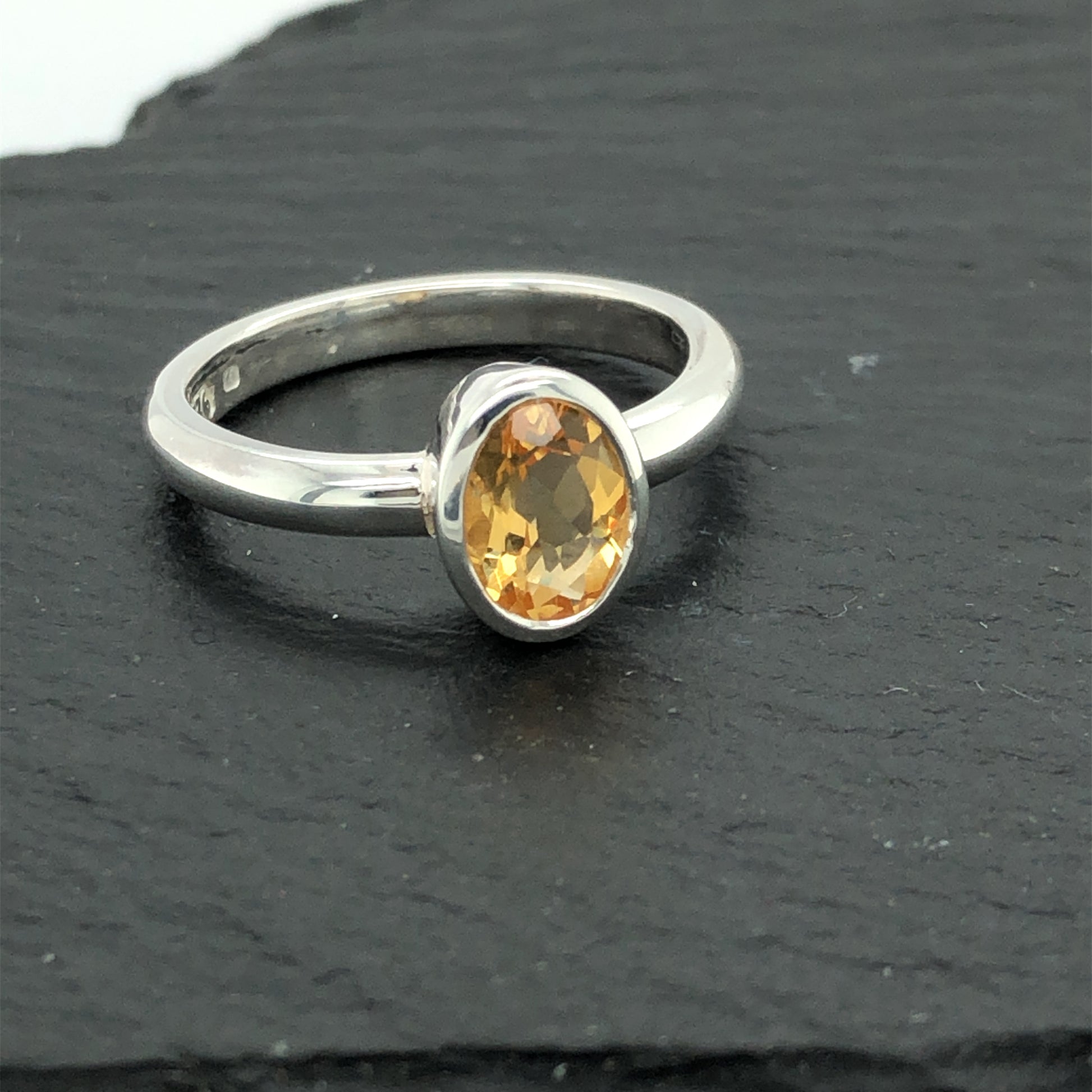 The Ring is entirely handmade from Sterling Silver and features a lovely 8x6mm genuine oval cut Citrine Gemstone , set within a protective rub over setting.