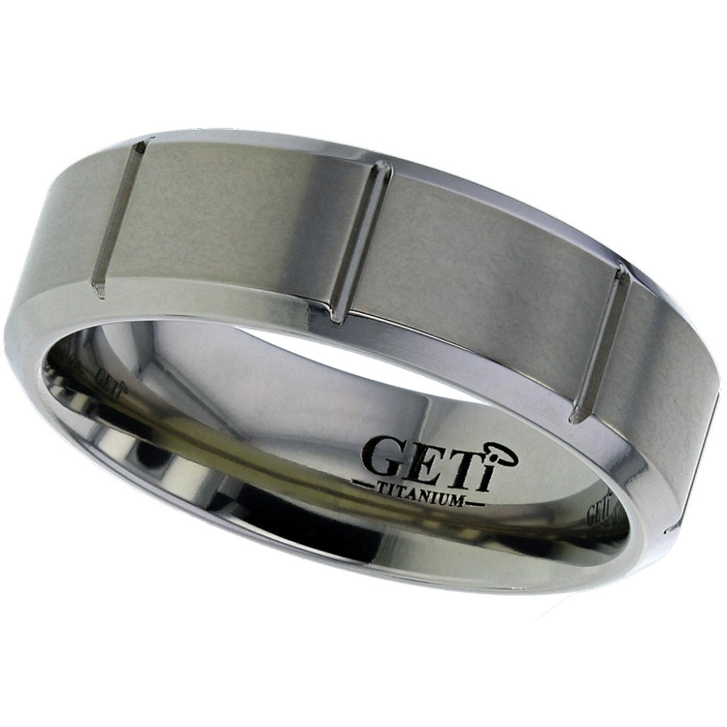 Flat profile Titanium ring with chamfered edges and sectioned design pattern.