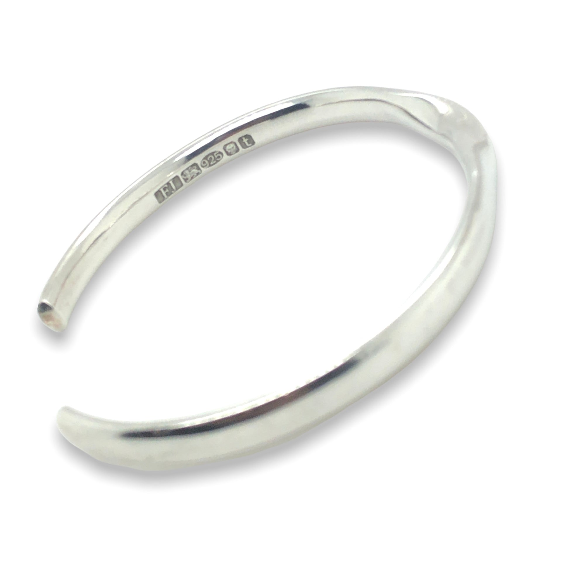 A Medium Weight unisex Torque bangle with a twist. The cuff has an oval profile for a sleek design & comfortable fit. The cuff is somewhat adjustable & is squeezed up once on the wrist.